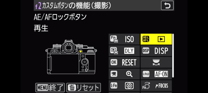 一等席を陣取っている「AF-ON」(親指AF)ボタンに「再生」をアサインしてやりました。