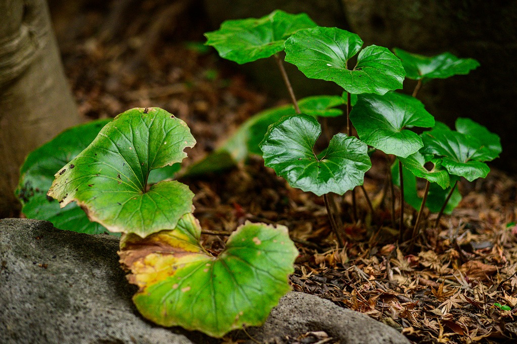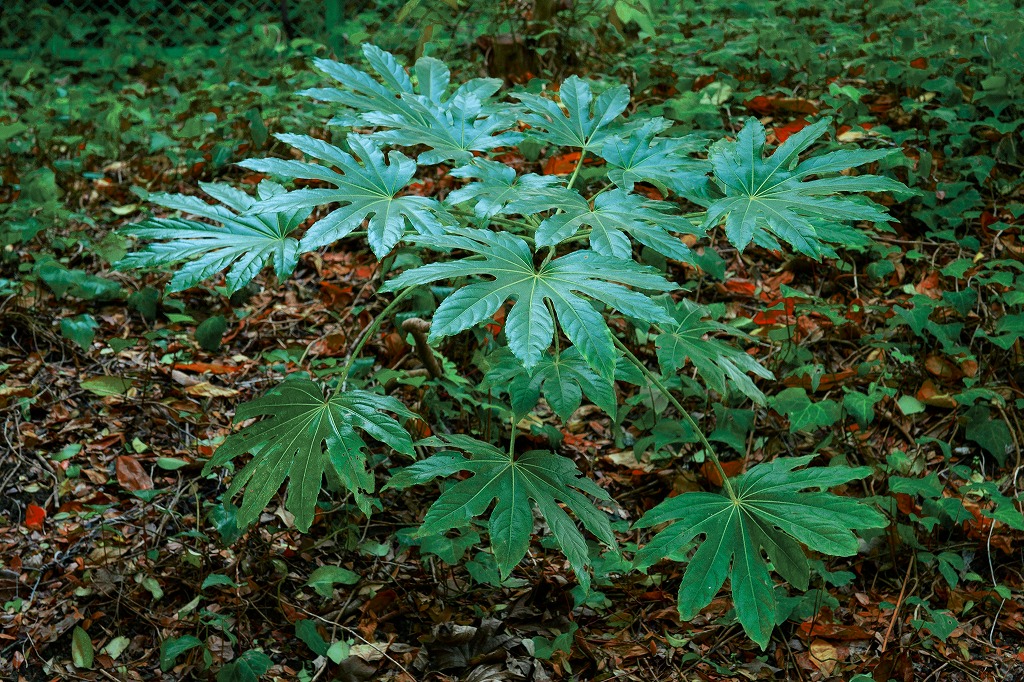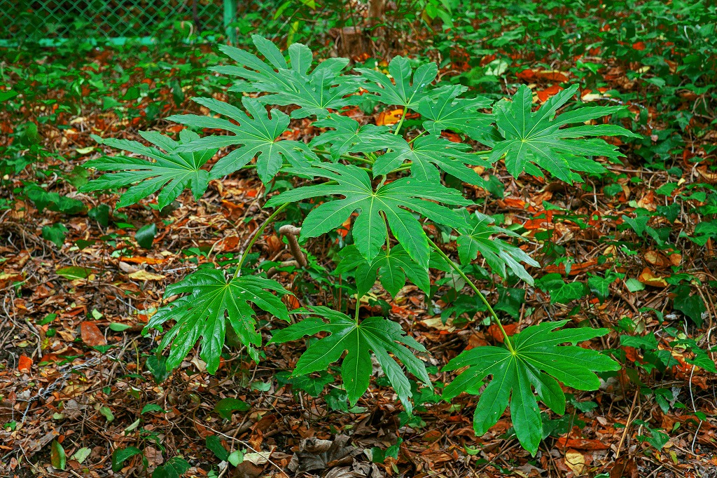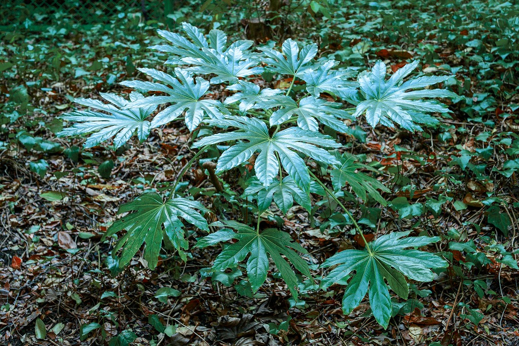 薄暗い茂みの中に、木漏れ日を浴びて 一際目立ってた、天狗の葉っぱ(ヤツデ)