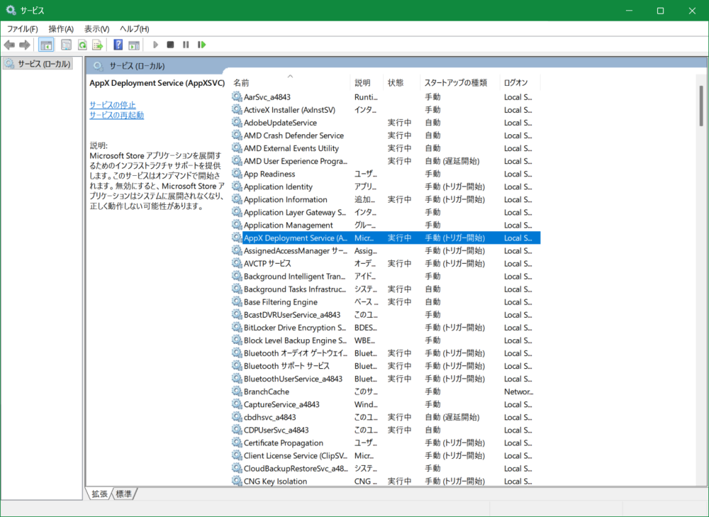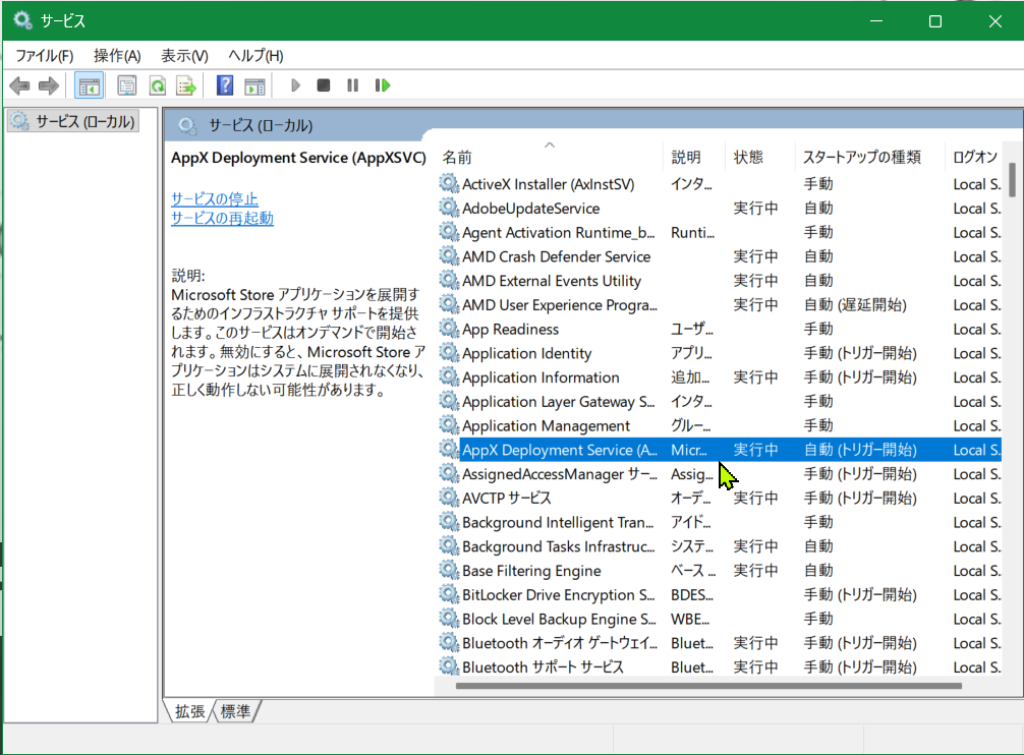 ↙左ペインの「AppXSvc」を右クリックし・・・右側に表示された・・・