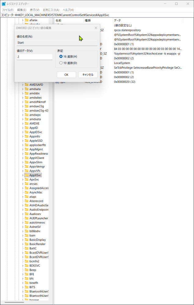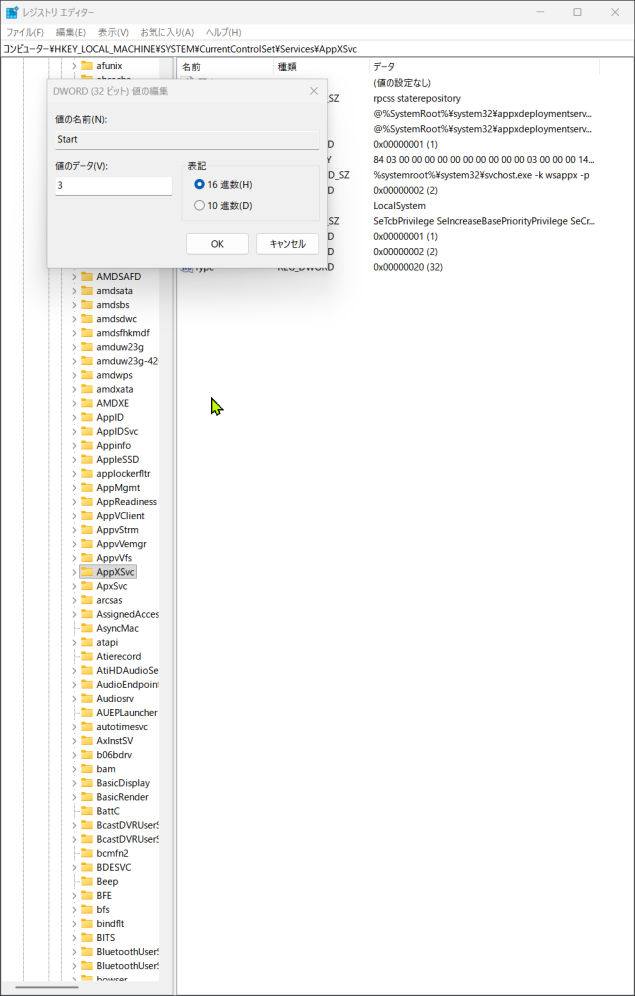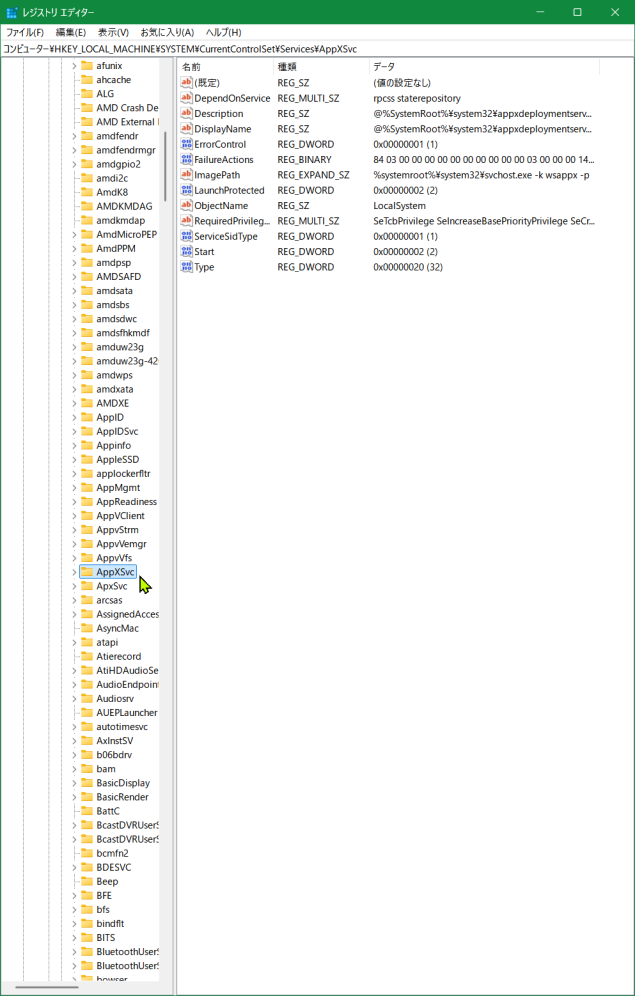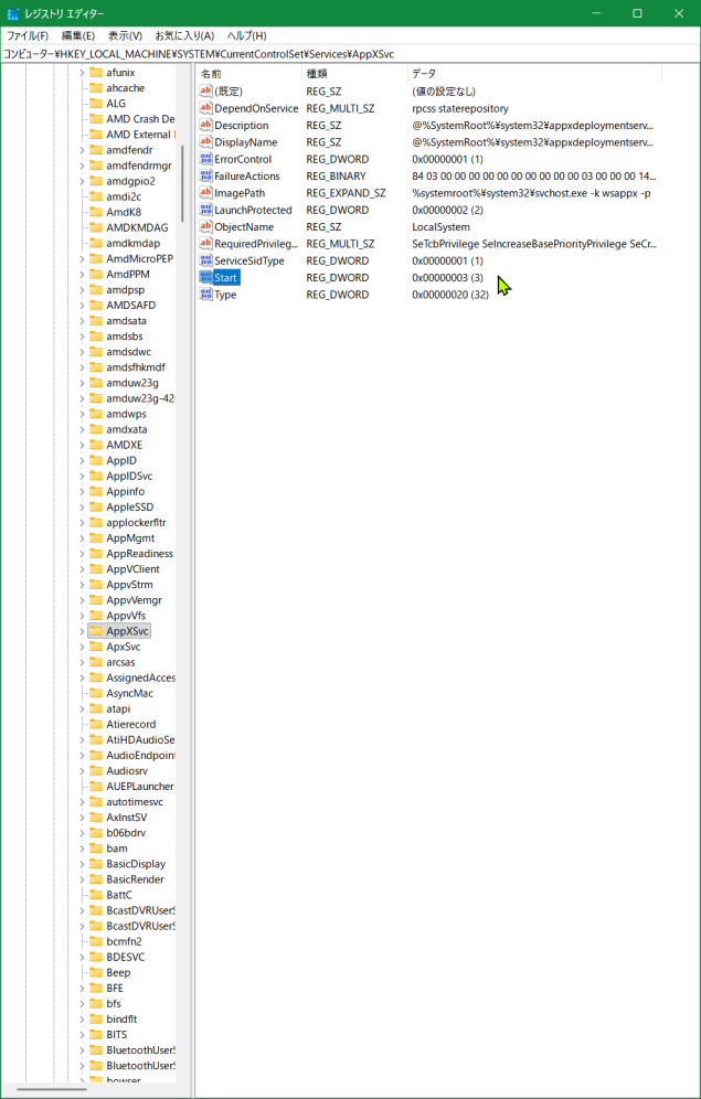 HKEY_LOCAL_MACHINE\SYSTEM\CurrentrolSet\Sevices\AppXSvcっと進み・・・